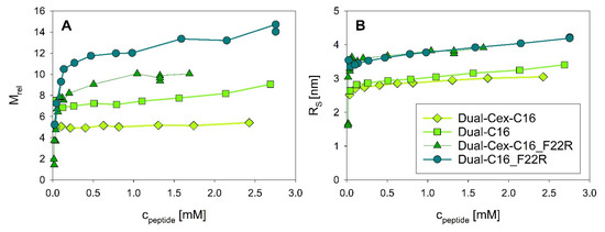 Figure 8. Association equilibria of palmitic acid conjugated Dual-Cex and derived variants. Relative molecular masses Mrel (A) and Stokes radii RS (B) were measured at 23 °C in PBS at pH 7.4. The according data for Dual-Cex-C16 and Dual-C16 were previously published [4] and are shown for contextual reasons.