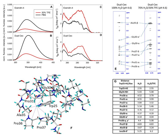 Figure 9. Spectral signatures of exendin-4 and Dual-Cex in PBS and 30% TFE. Normalized Trp fluorescence (A,B) and near-UV CD (C,D) spectra of exendin-4 (A,C) and Dual-Cex (B,D) in PBS and PBS + 30% TFE. Regions of the NOESY spectra of Dual-Cex in water and in 30% TFE illustrating NOEs between Trp25-H1 and protons of residues involved in the formation of the Trp-cage (Gly30, Pro31, Ala35, Pro36, Pro37) (E). Interproton distances (illustrated as dashed lines in (F); grey, red, blue and light blue colors represent carbon, oxygen, nitrogen and hydrogen atoms, respectively) were obtained by integration of the NOESY peaks using the distance between Trp25-H1 and Trp25-H2 as reference peak (distance was set to 2.55 Å) (G).