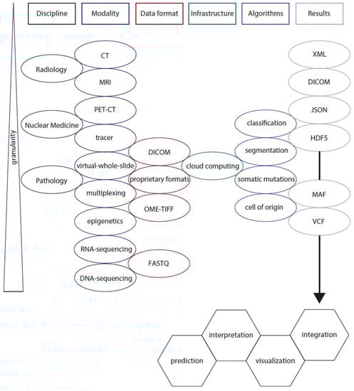 Schematic of integrative data analysis in oncology. Diagnostic medical disciplines, including Radiology, Nuclear Medicine and Pathology are gathering data using their different modalities, like computer tomography (CT), magnetic resonance imaging (MRI), positron emission tomography (PET-CT), as well as tracers that are able to highlight molecules of interest. While Radiology and Nuclear Medicine share a sophisticated data format of digital imaging and communications in medicine (DICOM) objects, which includes relevant (pseudonymized) patient (meta) data, other formats from virtual-whole-slide images and multiplexing techniques may be stored using proprietary vendor formats. The maturing file format of open microscopy environment tagged file format (OME-TIFF) appears to be especially interesting as future solution, as DICOM objects for virtual-microscopy-images have not yet been broadly accepted by the community [97,112,114]. Cloud computing services would require specialized structures, like central processing units (CPU) and graphical processing units (GPU) that meet the desired calculating capabilities. In the near future, several specialized algorithms will be executed allowing segmentation of regions of interest and classification of image objects, in addition to accurate variant calling and methylome-based cell of origin determination using epigenetics. The given results of image analysis are stored using extensible markup language (XML), DICOM objects or JavaScript Object Notation (JSON), together with Hierarchical Data Format (HDF5). Here, spatial descriptive statistics of cellular and subcellular structures of interest are calculated. Data formats like variant calling files (VCF) and Mutation Annotation Format (MAF; https://docs.gdc.cancer.gov/Data/File_Formats/MAF_Format/, accessed on 3 September 2021) may be used to store results of DNA-sequencing. Finally, the data need to be integrated and visualized [115,116] to allow interpretation in order to allow patient stratification, identifying risk groups of cancer patients and to predict therapy responses. Given the increasing complexity within oncology, analytical tools are needed to retrieve current information on drug targets, clinical trials and potential treatment options, which may need to be integrated in a given workflow [117,118].