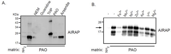 Arsenite-induced protein misfolding occurs through binding to vicinal cysteine residues []. AIRAP is a short polypeptide highly enriched with cysteine residues that coordinate through two AN1 type zinc fingers the binding of zinc residues. To evaluate the possibility of the direct binding of AIRAP to arsenite, we utilized an immobilized bivalent form of arsenite (phenylarsine oxide (PAO)) previously demonstrated to bind arsenite-binding proteins [].