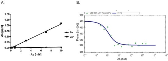 As AIRAP is a zinc-binding protein, zinc may serve as a primary structural enhancer to enable the optimal positioning of cysteine residues to bind arsenite. This notion is further supported by our results with the PAO matrix (Figure 1B). To directly measure the protein’s capacity to bind arsenite in a zinc-dependent manner, we measured arsenite binding to AIRAP by inductively coupled plasma optical emission spectroscopy (ICP-OES). Purified AIRAP was incubated with increasing concentrations of arsenite in the presence or absence of zinc, and arsenite content was evaluated. As seen in Figure 2A, AIRAP binding to arsenite was greatly enhanced when first incubated with zinc (marked Zn+). These results coincided with the indicated increase in AIRAP binding to the PAO matrix upon zinc incubation (Figure 1B). Analytical evaluation of this interaction was performed to determine the Kd value of AIRAP to arsenite using a micro-scale thermophoresis (MST) methodology []. A Kd of 7 nM ± 0.87 nM was determined (Figure 2B), demonstrating the high affinity of AIRAP toward arsenite.