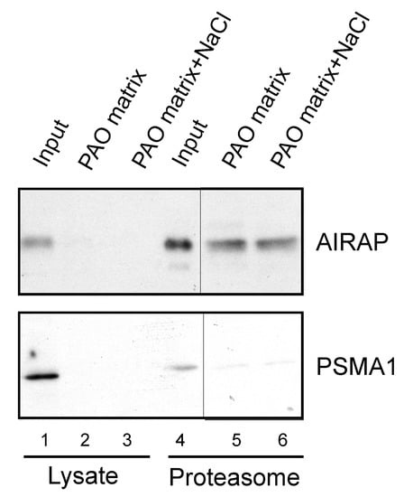 After examining the in vitro binding of AIRAP to arsenite, we addressed the ability of endogenous AIRAP to bind arsenite. To this end, we used the cell lysate as a source for AIRAP. Upon endogenous expression of AIRAP (induced by arsenite treatment), AIRAP could not be detected on the PAO matrix from total lysate (Figure 3, lanes 2 and 3) but could be detected from purified proteasomes (Figure 3, lanes 5 and 6). It is important to note that the interaction was stable even after a high-salt wash, as would be expected from a metal-coordinated binding to the PAO matrix (lane 6). In addition, although catalytic particle subunit PSMA1 was present in the total lysate and the proteasome fractions (Figure 3 lane 4), it was barely detectable in the PAO matrix-purified fractions; thus, PSMA1 served as a specificity control for the PAO matrix binding. We reasoned that the lack of AIRAP binding to the PAO matrix in the total lysate may have been due to the existence of other proteins that competed towards the PAO matrix binding, or it may have indicated a structural change that AIRAP may undergo upon proteasome binding. This transition may be intended towards optimal binding to arsenite only upon proteasome binding.