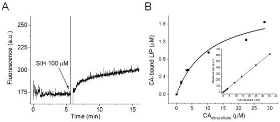 Quantification of the LIP in RAW 264.7 cells. (A). Fluorescence trace of Calcein-AM-loaded RAW 264.7 cells upon introduction of SIH. Pre-warmed 3-mL suspensions of 15 × 106 cells previously treated with Calcein-AM (0.25, 0.5, 1.0, 2.0, or 3.0 µM) at 37 °C for 20 min were placed in the fluorimeter. When the baseline was established, SIH (100 µM) was added, as designated in the plot. The conditions and fluorescence acquisition parameter settings were as follows: PBS, 100 µM DTPA, pH 7.4, T = 37 °C, λex = 495 nm, λem = 516 nm, ex and em slit width = 3 nm. (B). Intracellular concentration of the CA-bound LIP as a function of the intracellular concentration of free CA. The concentration of the LIP was taken as the limiting concentration of the CA-bound LIP and was determined by fitting the data of Figure 1A to a hyperbolic equation with the aid of Origin 2019 (Academic), OriginLab Corporation, Northampton, MA, USA. The intracellular concentrations of free CA and the CA-bound LIP were determined by unit transformation; the concentrations of the solutions of CA and the CA-bound LIP were determined with the help of a standard analytical curve of fluorescence versus known concentrations of free CA (inset) in control Calcein-AM untreated cells (15 × 106 cells in 3 mL) and in the presence of SIH under the same conditions of the experiments. The CA assays were performed in a conventional spectrofluorometer (Shimadzu RF-5301pc).