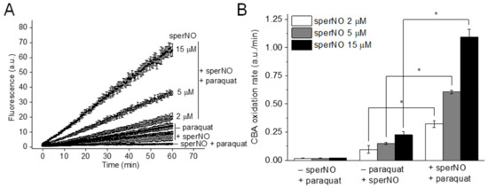 Formation of peroxynitrite by paraquat and NO• donor in cells. Briefly, suspensions of RAW 264.7 cells were transferred to 96-well plates (1.2 × 107 cells/mL). CBA (10 μM), paraquat (10 μM), and sperNO (2, 5 or 15 µM) were individually added to selected wells, in this order. (A). COH fluorescence as a function of time. The measurements were initiated immediately after sperNO was introduced, and the fluorescence was registered every minute for one hour. The data represent the mean ± SD (n = 4). (B). Increase in the rate of COH fluorescence. This parameter was determined by linear regression of the fluorescence data presented in panel A within the first 10 min of each run. The data represent the mean of four independent experiments ± S.D. and are statistically significant at the 95% confidence interval relative to control cells * (p < 0.05, Paired Student’s t-test). The assays were performed in PBS, DTPA (100 µM), at pH 7.4 and 37 °C, and the fluorescence acquisition parameters were λex = 332 nm, λem = 456 nm, and ex and em slit width = 9 and 15 nm, respectively.