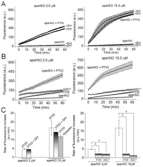 To test whether H2DCF reacted with peroxynitrite-derived radicals under our experimental conditions, we had to design a strategy to deliver these species specifically to the cellular suspension model. We selected as the prototype species. The radical is a freely diffusible species that can rapidly access the cytosolic space [47,48], and it reacts rapidly with H2DCF (k = 1.3 × 107 M−1s−1) [40]. To the best of our knowledge, no currently available method can specifically deliver a continuous and sustained flux of the other peroxynitrite-derived species OH• and in the absence of other oxidants in cells. On the other hand, we generated increasing fluxes of practically devoid of NO• and other oxidants by mixing different concentrations of NO• donor with excess 2-phenyl-4,4,5,5-tetramethylimidazoline-1-oxyl 3-oxide (PTIO), an imidazoline-oxyl N-oxide that oxidizes NO• to [49,50,51,52,53,54] (Supplementary Material, Figure S2). We performed the experiment as follows. We placed H2DCF-loaded RAW 264.7 cells in 96-well plates and challenged them with sperNO in the presence of 250 µM PTIO, in the absence and in the presence of the chelator SIH (Figure 3A). As expected, compared to sperNO alone, PTIO, which fully oxidized NO• to , dramatically increased the rate at which DCF was formed. SIH had no effect on the H2DCF oxidation under these conditions. That was the H2DCF oxidant in these experiments was confirmed by performing experiments in the presence of rapid scavengers, hexacyanoferrate (II) (FCN) [55,56] and ascorbate (ASC−) [57]. Neither FCN nor ASC− reacts rapidly or at all with peroxynitrite, and both fully prevented the increase in DCF fluorescence induced by the combination of the NO• donor and PTIO without any filter effect on the fluorescence of DCF (Figure 3B,C right panel). Therefore, H2DCF efficiently competed with other intracellular targets for . In the experiments conducted with 15 µM sperNO, the rate at which the fluorescence increased slowed down toward the end of the run. The reason for this behavior was unclear, but it could involve exhaustion of H2DCF or further oxidation of the product DCF by [43], although the rate constant for the reaction between DCF and is two orders of magnitude lower than the reaction between DCF and the reduced PTIO.