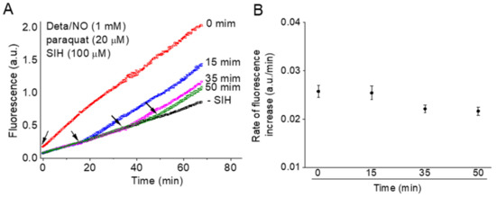 The rate of intracellular oxidation of H2DCF as a function of the time when SIH was added. (A). Fluorescence traces due to the formation of DCF. The experiments were performed as described in Figure 4; 2,2′-(hydroxy-nitroso-hydrazono)bis-ethanimine (Deta/NO) was used as NO• donor in the presence of paraquat. SIH was added before or at selected time points during the run, as designated in the figure. Deta/NO has a long half-life under the experimental conditions, producing a constant flux of NO• in the time scale of the experiments. The data represent the mean ± S.D. of four experiments; (B). The rate at which the fluorescence increased after SIH was introduced. The rate was determined by linear regression of the fluorescence traces in the final 5 min of the collected data. The data represent the mean of four independent experiments ± S.D. The conditions and fluorescence acquisition and parameter settings were the same as those described in Figure 3.