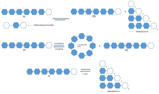 Amylomaltases are prokaryotic 4-α-glucanotransferases (4α-GTases) of the CAZy glycoside hydrolase (GH) family GH77 [1], accessed on 3 Sepetember 2021. This family contains only enzymes of the E.C. 2.4.1.25 class, detected both in prokaryotes (amylomaltases) and in plants and algae (named disproportionating enzymes, or D-enzymes). It should be noted that 4α-GTases are not unique to the GH77 family, as they can also be detected, with different sequence characteristics, in the GH13 and GH57 families. The 4α-GTase enzyme catalyses the hydrolysis of glucosidic bonds in α-1,4′-d-glucans and the transfer of the glucoside with the newly formed reducing end to the 4′-position of an α-1,4′-d-glucan acceptor. Details on the distribution in nature of 4α-GTases, their requirements for donor and acceptor substrates and the resulting products have been already reviewed [2]. The transferase reaction can also be intramolecular, leading to the synthesis of circular molecules composed of six to eight glucose units, known as cyclodextrins (CDs), and cycloamyloses (CAs), which are generally large-ring cyclodextrins with a degree of polymerization (DP) from sixteen to several hundred glucose units [2,3]. Low molecular weight CAs with 5–7 DP have also been detected and will be reported in this review. D-enzymes are involved in the synthesis of CDs, while amylomaltases produce the larger CAs.