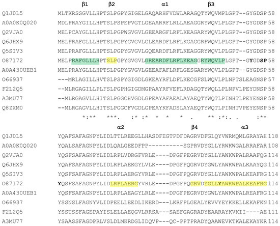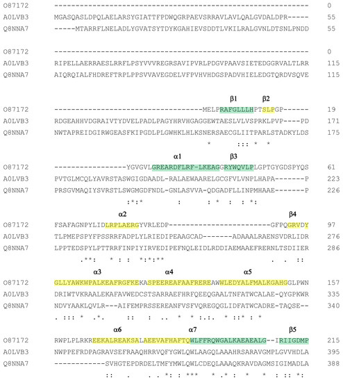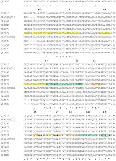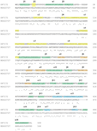 Multialignment of amylomaltases from H. walsbyi (MZ422727) and T. thermophilus (O87172). Sequences of enzymes are indicated by the UniProt accession number for the T. thermophilus enzyme and by the GenBank accession number for the H. walsby enzyme. Other details of the sequences are reported in Table 1. The order of the sequences and amino acid conservation symbols are as obtained by the Clustal program [54] (in particular, asterisks indicate identical residues; colons and dots indicate conserved and semi-conserved substitutions, respectively). Secondary structure description is related to amylomaltase from T. thermophilus according to the 3D structure described by Przylas et al. [51]. In particular, green regions refer to the (β/α)8 TIM barrel (domain A); the other coloured regions correspond to subdomain B1 (orange), subdomain B2 (yellow) and subdomain B3 (cyan).