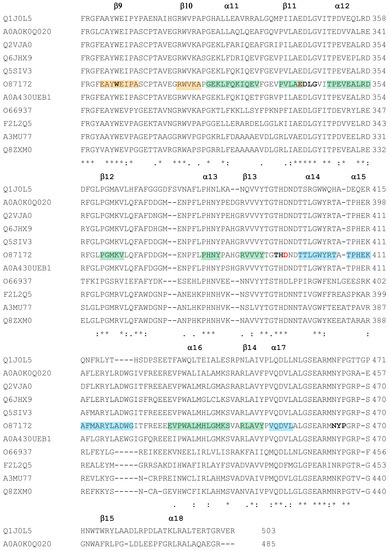 A last difference can be observed in the correspondence of T254, which is substituted by acidic residues in the halophilic and mesophilic enzymes (residues D306 and D256, respectively, coloured in yellow in Figure 6C,D). These variations are currently not easy to interpret, as they increase the surface charges in two enzymes with different reaction conditions.