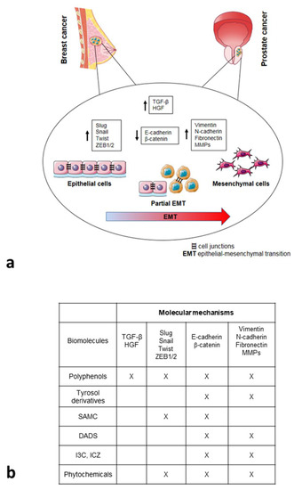 Epithelial-to-mesenchymal transition (EMT) program in breast and prostate cancers and roles exerted by different compounds belonging to Mediterranean diet. (a) Molecular processes leading to EMT development. MMPs, metalloproteinases; TGF-β, transforming growth factor beta; HGF, hepatocyte growth factor (figure created using Servier Medical Art available at https://smart.servier.com, accessed on 10 June 2021). (b) Bioactive molecules in EMT process grouped for chemical nature and their site of action, which is indicated by “X”.