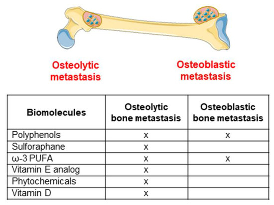 There are a plenty of studies highlighting the ability of different natural compounds, mainly present in vegetables, to inhibit or counteract the formation and progression of bone metastasis. Although these studies are not directly related to breast/prostate cancer, it is of interest to consider them in the perspective that some of these compounds and activities could in the future also be associated with prostate/breast cancer and bone metastasis.