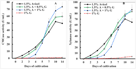 Effect of glycerol (G) as an additional carbon source on the production of endoglucanase (A) and xylanase (B) during submerged fermentation of Avicel by I. lacteus.