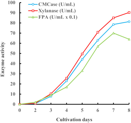 Traces of cellulase and xylanase activity were detected after two days of fungus cultivation (Figure 2). Thereafter, intense secretion of polysaccharide-hydrolyzing enzymes was observed. The activity of endoglucanase and xylanase reached its maximum after 8 days of fermentation, while FPA was picked on the seventh day of I. lacteus cultivation. The enzyme preparation (210 mL) isolated from the culture liquid contained 1710 U/mL CMCase, 2090 U/mL xylanase, and 150 U/mL FPA.