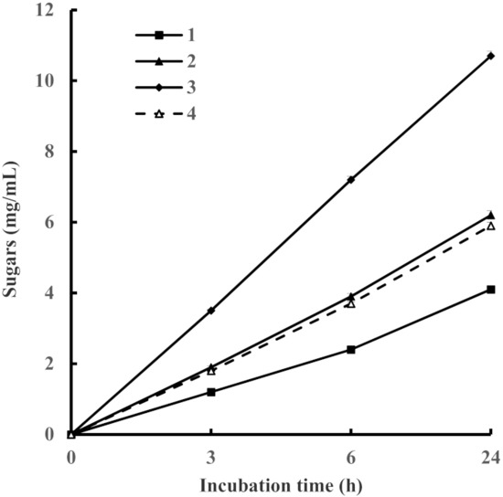 Accumulation of reducing sugars during hydrolysis of pretreated wheat straw (WS) using I. lacteus (1–3) and commercial (4) enzyme preparations. Enzyme load–20 U/g substrate. 1–10 mg WS; 2, 4–20 mg WS; 3–40 mg WS.