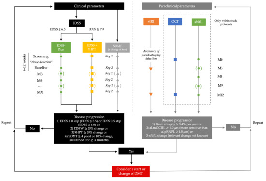 SDMT was used in the EXPAND clinical trial in which a ≥4-point or ≥10% change in SDMT was considered clinically relevant [64,65]. The necessary time frame to determine disease progression with SDMT is ≥3 months.