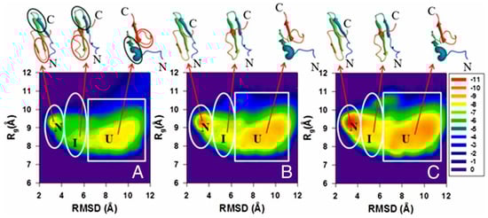 Variation of the distribution of conformational states in terms of FELs (in kcal/mol) along the C-RMSD and order parameters for the wild-type FBP28 WW domain. The data have been collected from different sections of all 512 trajectory sets for the molecule (shown in (A–C), respectively). The FEL corresponding to the initial parts of the trajectories (with the average fraction of the native structures up to 20% of the maximum fraction) is shown in (A); the FEL from the middle parts of the trajectories (the fraction of the native structures between 20% and 50% of the maximum fraction) is shown in (B); and the FEL from the final parts of the trajectories (the fraction of the native structures exceeds 50% of the maximum fraction) is shown in (C), respectively. The letters “U”, “I” and “N” correspond to unfolded, intermediate and native states, respectively. The representative structures of unfolded, intermediate and native states are plotted on top of each state. Hairpin 1 and hairpin 2 are circled by black and red lines, correspondingly, in (A). Reproduced from R. Zhou et al. Proc. Natl. Acad. Sci. USA, 111, 18243–18248 (2014). Copyright 2014 National Academy of Sciences.