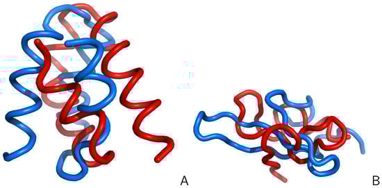 Superpositions of the experimental (blue) and intermediate (red) structures of (A) 1BDD and (B) 1E0L proteins. Reproduced from A. Lipska et al., J. Chem. Phys. 144, 184110 (2016), with the permission of AIP Publishing.