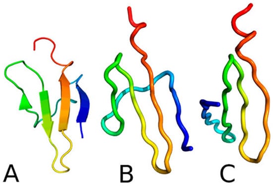 Experimental structure of pT37pT46 4E-BP2 (A) compared with the most similar structures obtained after simulations and clustering of pT37pT46 4E-BP2 (B) and WT 4E-BP2 (C). Reproduced with permission from A.K. Sieradzan et al., J. Chem. Theory Comput. 17, 3203–3220 (2021). Copyright 2021 American Chemical Society.