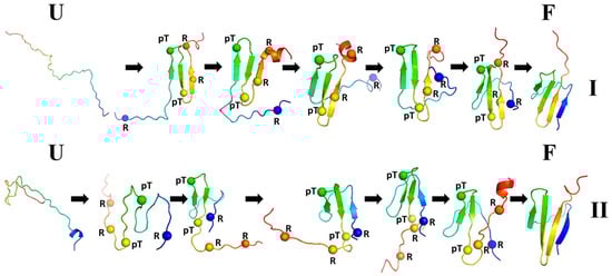 Two folding pathways of pT37pT46 4E-BP2 found by UNRES MD simulations. Reproduced with permission from A.K. Sieradzan et al., J. Chem. Theory Comput. 17, 3203–3220 (2021). Copyright 2021 American Chemical Society.