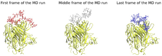 The heparin movement on the protein’s surface in the course of the MD run. Some parts of the HP tend to move substantially during MD runs, searching for an energetically more favorable pose (heparin in licorice representation, red, white, and blue color; APRIL, BCMA, TACI in cartoon representation, yellow color).