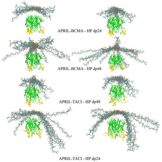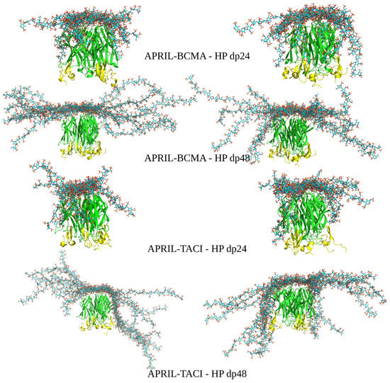 RS-REMD simulations for HP dp24 and dp48 were performed for both APRIL–BCMA and APRIL–TACE complexes, and the results were compared with the ones obtained from Autodock3 described above. Afterward, a refinement procedure was carried out for the docking poses obtained during the RS-REMD simulation, as was described in detail in our previous work [24]. First, MM-GBSA analysis for the whole RS-REMD trajectories was performed, then 10 docking poses with the lowest electrostatic energy were selected for the refinement procedure, as this free energy component proved to perform better for scoring in protein–GAG systems [24]. At the same time, 10 poses were also selected manually based on the visual criteria that the HP lateral parts were directed toward the BCMA/TACI APRIL receptors to determine if such structures could be energetically favorable in comparison to other ones, which potentially could mean that HP molecules favourize the binding between APRIL and its receptors. All starting structures are presented in Figure 3.