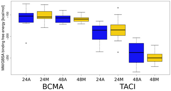 MM/GBSA binding free energies obtained for APRIL–BCMA/TACI–HP systems. Boxplot representation for the values provided in Table S2 is plotted: X-axis, BCMA and TACI correspond to the APRIL complexes with BCMA and TACI, respectively; 24 and 48 correspond to HP dp24 and HP dp48, respectively; A and M correspond to the automatically and manually selected structures, respectively.
