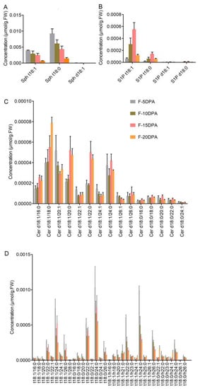 The concentration of simple sphingolipids in cotton fiber cells at four developmental stages. (A) The concentration of various molecular species of Sph. (B) The concentration of various molecular species of S1P. (C) The concentration of various molecular species of Cer. (D) The concentration of various molecular species of PhytoCer in cotton fiber cells at four developmental stages. Sph, sphingosines; S1P, sphingosine-1-phosphate; Cer, ceramides. “d18:0/1” indicates that the long-chain bases (LCB) of sphingolipids had w hydroxyl groups (d), 18 carbon atoms, and no or 1 double bond; “t18:0/1” indicates that the LCB had 3 hydroxyl groups (t), 18 carbon atoms, and no or 1 double bond; “16-26:0/1” indicates that the long-chain fatty acid (LCFA) of sphingolipids had 16 to 26 carbon atoms and no or one double bond; and “h16-26:0/1” indicates that the long-chain fatty acid (LCFA) of sphingolipids was a hydroxylated fatty acyl (h) and had 16 to 26 carbon atoms and no or 1 double bond. F-5 DPA, F-10 DPA, F-15 DPA, and F-20 DPA represent fiber cells at 5, 10, 15, and 20 DPA. Each analysis was repeated with three biological replicates.