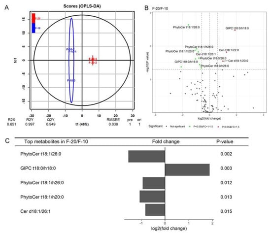 Differences in sphingolipids species in fiber cells between 10 DPA and 20 DPA. (A) The OPLS-DA score plot between the 10 DPA group and the 20 DPA group. (B) Volcano map of sphingolipid molecular species in fiber cells between 10 DPA and 20 DPA. (C) The fold changes of the five top sphingolipid molecular species that changed significantly between 10 DPA and 20 DPA. Cer, ceramides; PhytoCer, phytoceramides; GIPC, glycosyl-inositol-phospho-ceramides. “d18:0/1” indicates that the long-chain bases (LCB) of sphingolipids had 2 hydroxyl groups (d), 18 carbon atoms, and no or 1 double bond; “t18:0/1” indicates that the LCB had 3 hydroxyl groups (t), 18 carbon atoms, and no or 1 double bond; “16-26:0/1” indicates that the long-chain fatty acid (LCFA) of sphingolipids had 16 to 26 carbon atoms and no or 1 double bond; and “h16-26:0” indicates that the long-chain fatty acids (LCFA) of sphingolipids were hydroxylated fatty acyls (h) and had 16 to 26 carbon atoms and no double bond.