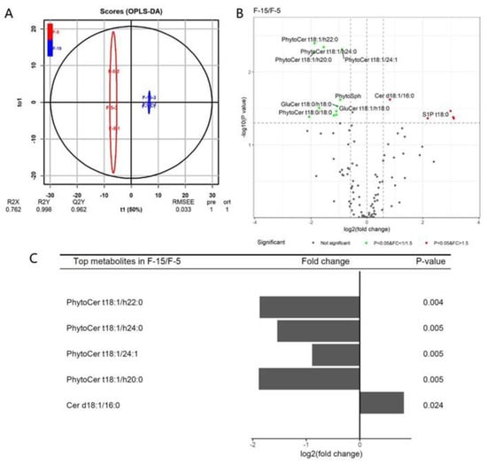 The elongation stage (the primary wall synthesis stage) and the SCW synthesis stage are two important stages in fiber cell development and have an important effect on the fiber quality and yield. The elongation period lasts about 16–20 days (from ~3 DPA to ~20 DPA). During this period, the rate and duration of elongation influences the final length of the fibers. The secondary wall synthesis period lasts about 20–25 days (from ~20 DPA to ~45 DPA). In this stage, the rate and duration of cellulose synthesis and secondary wall deposition affect the strength and fineness of mature fibers. As shown in the score plot (Figure 4A), there were six scores for each group, and two groups were clearly separated. In the model, R2Y = 0.997 and Q2 = 0.949 for the F-20 and F-10 groups (Figure 4A), and R2Y = 0.998 and Q2 = 0.962 for the F-5 and F-15 groups (Figure 5A), indicating that the quality of the OPLS-DA model was excellent for screening the key sphingolipid differences between the two samples. Compared to fibers at 10 DPA, three sphingolipid molecular species, Cer d18:1/20:0, Cer d18:1/22:0, and GIPC t18:0/h18:0, were significantly upregulated (p-value (p) < 0.05, fold change (FC) > 1.5), and seven sphingolipid molecular species, Cer d18:1/26:1, PhytoCer t18:1/ 26:0, PhytoCer t18:0/26:0, PhytoCer t18:1/h20:0, PhytoCer t18:1/ 26:0, PhytoCer t18:0/h26:0, and GIPC t18:0/h16:0, were significantly downregulated (p < 0.05, FC < 1/1.5) at 20 DPA (Figure 4B). The top five molecular species with the greatest amount of change were PhytoCer t18:1/26:0, PhytoCer t18:1/h26:0, PhytoCer t18:1/h20:0, GIPC t18:0/h18:0, and Cer d18:1/26:1, all of which accumulated greatly at the elongation stage, except for GIPC t18:0/h18:0 (Figure 4C). The results showed that Cers accumulated during the SCW deposition stage, while PhytoCers, especially unsaturated PhytoCers containing saturated and hydroxylated C26 FA, significantly accumulated during the fiber cell elongation stage.