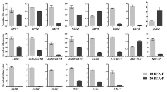 To understand the expression profile of the genes involved in sphingolipid biosynthesis and metabolism during the growth and development of fiber cells, we analyzed the expression level of target genes from the FGD database (https://cottonfgd.org/ (accessed on 7 July 2021)) with RT-qPCR. The results showed that the expression levels of most genes were higher at the rapid elongation stage (10 DPA) compared to the SCW synthesis stage (20 DPA), such as SPTs, KSRs, LOHs and delta8 DESs; only three detected genes (SBH1, LOH2 and ACER3-2) were lower at the elongation stage (Figure 6). Simultaneously, the expression levels of the genes involved in VLCFA biosynthesis and modification were higher at 10 DPA than at 20 DPA (Figure 6). The results indicated that sphingolipid biosynthesis and metabolism were more active in elongating fiber cells. Particularly, the genes involved in LCB unsaturation and hydroxylation as well as in those involved in FA chain elongation and hydroxylation were highly expressed in elongating fiber cells, which might contribute to the high accumulation of unsaturated, tri-hydroxylated Cer-containing hydroxylated VLCFA in elongating fiber cells.