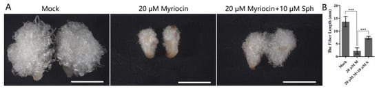 Exogenous application of myriocin and Sph to an in vitro ovule culture system. (A) Cotton ovules were collected at 2 DPA and were cultured for 10 days in the in vitro ovule culture system. BT medium adjusted with the amount of DMSO equivalent to that used to dissolve myriocin and sphingosine was used as the mock system. Bar = 5 mm. (B) The length the of fibers cultured for 10 days in the ovule culture system. Here, 20 μM M represents the 20 μM myriocin treatment, and 20 μM M + 10 μM S represents the 20 μM myriocin and 10 μM sphingosine treatment. Error bars represent the SD for at least 10 seeds. Triple asterisks indicate statistically significant differences between various treatments, as determined by Student’s t-test (*** p < 0.001).
