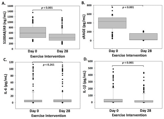 The main findings of our study are the significant reduction in both the pro-inflammatory molecule S100A8/A9 and sRAGEs after a four-week exercise intervention. Both results imply, in our opinion, an anti-inflammatory effect of exercise, supported by the reduction in the pivotal pro-inflammatory cytokine, IL-1β.