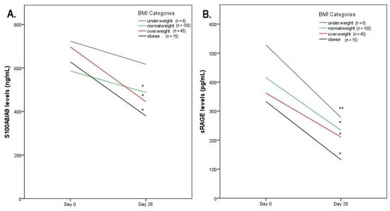 Line charts with biomarkers’ changes across BMI categories for S100A8/A9. (A) * p < 0.001 vs. baseline; sRAGE (B) * p < 0.001 vs. baseline, ** p < 0.005 vs. baseline. BMI Categories according to WHO Classification: <18.5 underweight, 18.5–25 normal weight, 25–30 overweight, >30 obese.