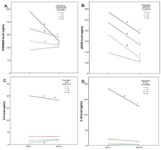 Line charts with biomarkers’ changes according to baseline values for S100A8/A9. (A) * p < 0.001 vs. baseline, ** p < 0.01 vs. baseline, a p < 0.001 vs. 1st, 2nd and 3rd quartile, b p < 0.001 vs. 1st quartile, c p < 0.01 vs. 1st quartile; sRAGE (B) * p < 0.001 vs. baseline, a p< 0.001 vs.1st quartile; IL-6 (C) * p < 0.001 vs. baseline,** p < 0.05 vs. baseline, a p < 0.001 vs. 3rd and 4th quartile, p < 0.05 vs. 2nd quartile, b p < 0.001 vs. 2nd quartile, p < 0.05 vs. 3rd quartile; IL-1β (D) * p < 0.001 vs. baseline, a p < 0.001 vs. 1st, 2nd and 3rd quartile.
