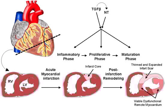 Cardiovascular disorders including ischemic heart disease are the leading cause of death worldwide and comprise syndromes like atherosclerosis, including coronary artery disease that clinically manifests as ischemic cardiomyopathy and myocardial infarction (MI) [1,2]. MI is typically caused by formation of an atherosclerotic plaque leading to a high-grade luminal narrowing of a coronary artery that results in insufficient blood supply and thus ischemia in the cardiac tissue downstream of the affected vessel (Figure 2) [43]. Cardiomyocytes are immediately perturbed in their contractility and as early as 20–30 min after the onset of ischemia, the affected sub-endocardial cardiomyocytes demonstrate irreparable alterations, and prolonged ischemic intervals unavoidably lead to cardiomyocyte cell death [83,84]. As the regenerative capacity of the adult heart is neglectable, the remaining tissue reacts with the formation of a collagen-based, fibrotic scar [85]. This scenario involves a finely orchestrated and complex sequence of inflammatory and reparative responses occurring in three partially overlapping phases: the inflammatory, the proliferative, and the maturation phase with the ultimate goal of replacing the necrotic cardiac tissue with connective tissue (Figure 2) [85,86]. In the inflammatory phase (approx. 3–4 days (d) after MI in mice), initiated by intense sterile inflammation, pro-inflammatory cytokines are critically involved in promoting macrophage activation to clear the wound from debris and dead cells [43,87]. The proliferative phase (approx. 4–8 d in mice) is characterized by the resolution of inflammation, proliferation of (myo)fibroblasts, and neovascularization [88,89]. In the subsequent maturation phase the production of a collagen-based extracellular matrix (ECM) network finally results in the formation of a fibrotic scar [89,90,91].