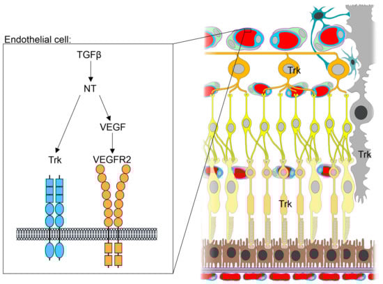 Besides the well-known role of neurotrophins in mediating growth, differentiation, and survival of neuronal and non-neuronal cells [31,42,116,117,118,119,120,122,138,200], there is emerging evidence that they contribute to the development of neovascularization in diseases such as diabetic retinopathy (DR) or age-related macular degeneration (AMD), too [11,201,202]. Neurotrophins mediate their pro-angiogenic effect either directly by binding to Trk receptors on endothelial cells or indirectly by inducing expression of VEGF in other cells (Figure 3) [12,96,100,203,204,205]. Accordingly, inhibition of VEGF via intravitreal application of bevacizumab, frequently used to inhibit neovascularization in patients suffering from (n)AMD or DR, results in a significant decrease of NGF levels in the retina [206]. Moreover, NGF treatment of choroidal endothelial cells increases their migration by 50%, indicating that neurotrophins have the capacity to modulate neoangiogenic processes as seen in DR or AMD [201,207]. Furthermore, immunohistochemical staining shows increased retinal NGF expression in a rat model of AMD-like retinopathy [11] and NT-3 and NT4/5 levels are elevated in vitreous samples of animals with experimentally induced proliferative DR [12].