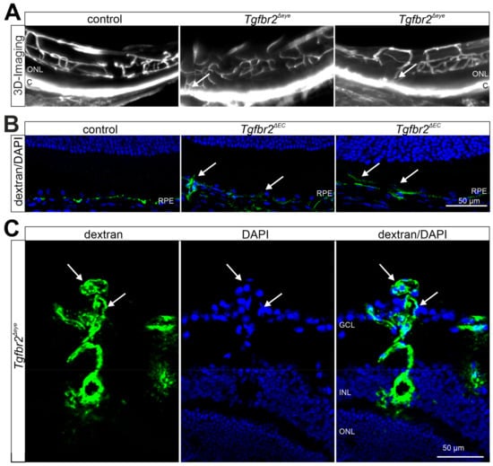 Deletion of TGFβ signaling results in retinal and choroidal neovascularization. (A) Light-sheet fluorescence microscopy of cleared eyes of 6-week-old lectin-injected Tgfbr2Δeye mice and a control littermate. The control mouse shows an essentially regular arborized retinal vasculature. The Tgfbr2Δeye mice have an irregular arrangement of the retinal plexus and develop choroidal neovascularization forming anastomoses between retinal and choroidal vessels (arrows). (B) FITC-dextran (green) perfused retinal meridional sections of 6-week-old Tgfbr2ΔEC mice and a control littermate. White arrows point toward tracer leakage in the retinal pigment epithelium (RPE; middle panel) and choroidal neovascularization (right panel) invading the RPE and subretinal space. Nuclei are DAPI stained (blue). (C) Meridional section of a 6-week-old FITC-dextran (green) perfused Tgfbr2Δeye retina shows neovascularization into the vitreous (white arrows), similar to what can be observed in patients suffering from proliferative diabetic retinopathy. Nuclei are DAPI stained (blue). The original data which we show in a slightly modified representation here, have been published in [35,41]. GCL = ganglion cell layer, INL = inner nuclear layer, ONL = outer nuclear layer, RPE = retinal pigment epithelium.