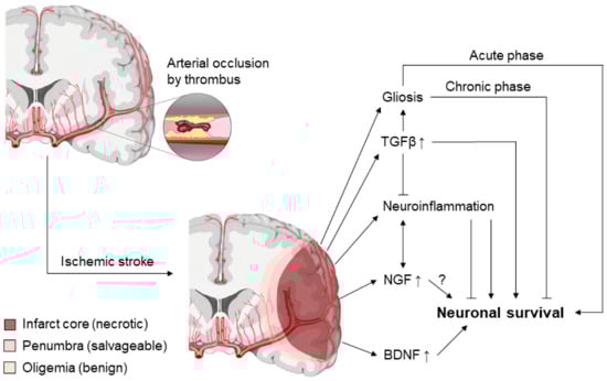 NGF and its receptors, TrkA and p75NTR, are upregulated in experimentally induced encephalomyelitis in mice [271], a finding that supports other studies suggesting cross-talk between the nervous system and the immune system via NGF [272,273,274,275,276]. Post-ischemic inflammatory responses are known to cause secondary neuronal damage in animal stroke models. Interleukin-1-deficient mice, for example, show ~70% reduction in infarct volume after focal brain ischemia compared to their wild-type littermates [277]. A beneficial effect of administration of a recombinant interleukin-1 receptor antagonist to rats after hypoxia-ischemia-induced cerebral infarction has also been shown [278]. Inhibition of microglia activation by isoflurane or edavarone reduces post-stroke infarct size in rats [279,280]. A circulating antibody against tumor necrosis factor α protects the rat brain from reperfusion injury [281]. However, clinical trials aiming at inhibiting neuroinflammation in stroke patients have been unsuccessful so far [282,283]. In fact, in recent years the role of post-ischemic neuroinflammation has been shown to be more complex and both beneficial and detrimental depending on the animal model, species, and type of elicited immune response (Figure 5) [284,285,286,287].