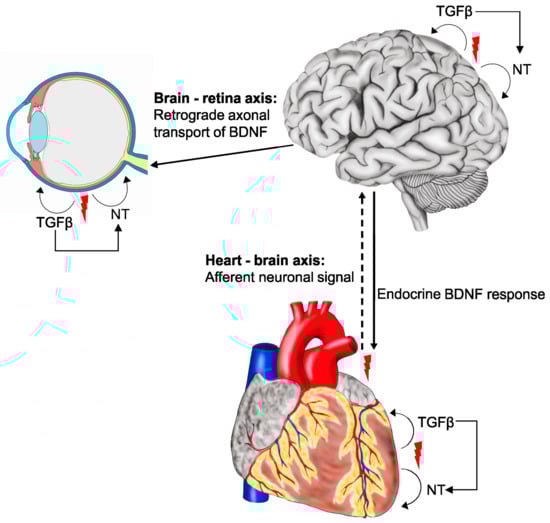 Cardiovascular diseases such as myocardial infarction and ischemic stroke are prevailing causes of death worldwide [1,2,3]. Ischemia, a hallmark of both disorders, unavoidably leads to cell death and concomitant impaired function of the respective organ. Moreover, ischemia in the eye promotes the progression of (neo)vascular retinopathies such as diabetic retinopathy (DR) and age-related macular degeneration (AMD), which are amongst the leading causes of blindness in the western world [4,5]. Intriguingly, there is a growing body of evidence that, following (ischemic) insults, neuronal and endocrine interactions between heart and brain as well as retina and brain promote recovery of the affected tissue [6,7,8]. Collectively these interactions can be referred to as the heart-retina-brain axis. Neurotrophins and transforming growth factor β (TGFβ) family ligands might constitute regulators along this axis as they are upregulated following ischemic insults in the heart, retina, and brain [6,9,10,11,12,13,14,15,16].