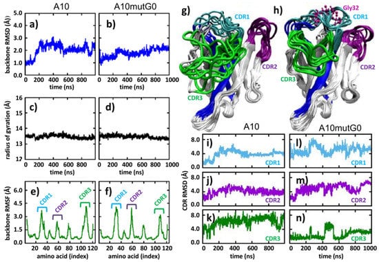 Molecular dynamics analyses. (a,b) Backbone root mean squared deviation (RMSD), (c,d) backbone radius of gyration (RMSF), (e,f) backbone root mean squared fluctuation, (g,h) overlap of conformations sampled every 100 ns, and (i–n) CDRs RMSD. (a,c,e,g,i–k) refer to A10 wt, while (b,d,f,h,l–n) refer to A10 mutG0. Color code: CDR1 (cyan), CDR2 (violet), CDR3 (green).