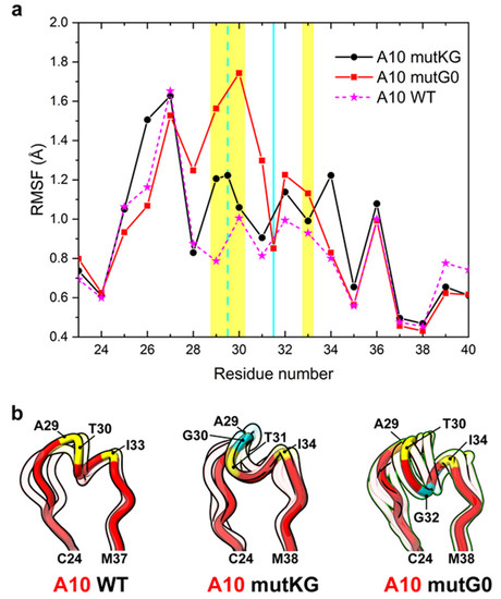 The models underwent a set of MD simulations from which the mutation-dependent ΔΔG in the CDR1 region was estimated (Figure 3a). Calculated results indicated that glycine insertion between A29 and T30 (mutKG and mutKG.1) are expected to reduce the relative contribution of A29 to the paratope (predicted ΔΔG ≈ 0.87/1.02 ± 0.39/0.63), and the loss is compensated by the concomitant binding strength increase of T30 to Her2 (ΔΔG ≈ −1.35/−1.24 ± 0.13/0.15). A29 is displaced from its contact with Her2 C563-C576 disulfide bridge, whereas T30 acquires a stacking hydrophobic interaction with F595 (Figure 3b). Furthermore, the A10-Her2 model [15] suggests that a glycine inserted between A29 and T30 should be exposed to and interact with the Her2 Y554 ring. The glycine insertion between S31 and N32 (mutG0, buried between the two exposed paratope regions formed by A29-T30 and I33) was predicted to affect the relative binding contributions of A29 and T30 with opposite and neutralizing effects in terms of ΔΔG (ΔΔG ≈ 1.78 ± 0.87 and ΔΔG ≈ −1.48 ± 0.56). Specifically, T30 was not displaced, and its contribution probably increased because its flexibility along the loop axis (Figure 4b, mutG0) improves hydrophobic contact with Her2 residues P595 and Y554 (Figure 3b). Note that not all of the highlighted residues are active at any given time.
