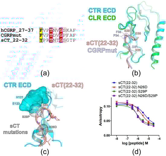 Rist et al. used a systemic approach to address the binding sites of CGRP for the CGRP receptor [26]. They reported a high-affinity ligand for the CGRP receptor that corresponded to human alpha CGRP(27–37) with N31D, S34P, and K35F mutations (CGRPmut). Sequence alignment of CGRP(27–37), CGRPmut, and sCT(22–32) was shown in Figure 1a. Since the crystal structures of receptor ECD-bound CGRPmut appeared similar to the CTR ECD-bound sCT structure (Figure 1b), those mutations were applied to the corresponding amino acids of sCT. However, K35F mutation of CGRPmut was not applied to the corresponding sCT G30 since Lee et al. reported that the alanine mutation of sCT G30 significantly decreased the sCT(22–32) binding for the CTR ECD suggesting that the flexibility of G30 helped sCT(22–32) binding [18]. Nevertheless, when the hypothetical structure of sCT(22–32) G30F was built, the G30F mutation visually did not make a clash with the nearby CTR ECD residue N124 (Figure S3).