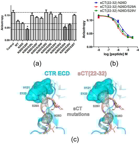 Mutational effects of sCT S29 residue on sCT(22–32) affinity. (a) FP competition peptide binding assay with 3 μM peptide analogs with mutations at S29. The mutations showing lower anisotropy values than that of sCT(22–32) N26D backbone peptide were indicated in dark gray. For comparison, anisotropy values of Control, sCT(22–32) with N26D mutation and sCT(22–32) with N26D/S29P mutations were indicated with dotted lines. Two technical replicates were used for each experiment. Anisotropy values from three independent experiments (each experiment has two technical replicates of anisotropy values for each peptide) were combined and the average anisotropy was shown with S.D. as error bars. Asterisk (*) indicates anisotropy decreases with a statistical significance (p < 0.05) compared to sCT(22–32) N26D. ANOVA with Dunnett’s post hoc test was performed with PRISM. sCT(22–32) N26D was used as a control group for the post hoc test. (b) FP competition peptide binding assay with sCT(22–32) N26D/S29A and N26D/S29V mutations. FITC-sCT(22–32) was used as a peptide probe. Representative peptide-binding curves were shown from three independent experiments. (c) Hypothetical structures of the CTR ECD (PDB 6PFO, Mol A) with sCT(22–32) with N26D/S29A (left) and N26D/S29V (right) mutations. CTR ECD H121, E123, and N124 and sCT N26D, S29A, and S29V mutated residues were shown both with stick and surface representations.