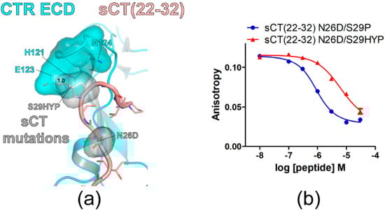 Hydroxyproline (HYP) is an uncommon amino acid produced from proline during post-translational protein modification through hydroxylation [27]. To confirm that small and hydrophobic side chains at the sCT S29 position are more suitable for CTR ECD binding, an HYP mutation was introduced to the sCT S29 position. When sCT S29 was mutated to HYP, the hypothetical structure suggested that its hydroxyl group located toward the E123 of the CTR ECD with a 1.0 Å distance producing a visual overlap between HYP and the CTR E123 residue (Figure 3a). Consistent with the hypothetical structure, sCT(22–32) with N26D/S29HYP mutations showed a marked affinity decrease for the CTR ECD by 13-fold compared to the affinity of sCT(22–32) with N26D/S29P mutations (Figure 3b and Table 2). These results are consistent with the idea that small and hydrophobic residues at the sCT S29 position are more suitable for CTR ECD binding.