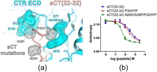The mutational strategies for developing high-affinity sCT peptide fragments came from the systemic report on CGRP and its high-affinity analogs [26]. In this report, Rist et al. developed three mutations of CGRP N31D, S34P and K35F that dramatically increased CGRP(27–37) affinity for the CGRP receptor. Recent structural studies on the CGRP receptor and the CTR ECD indicated that the receptor-binding mode of CGRP(27–37) with N31D, S34P, and K35F mutations (CGRPmut) was similar to that of sCT(22–32) [15,16,33]. This supports the idea that applying affinity-enhancing mutations to the corresponding residues of sCT would increase sCT(22–32) affinity for the CTR ECD. The current study provided evidence that this was the case for sCT(22–32) and the CTR ECD. Although the CGRPmut showed a 100-fold increase in CGRP affinity for its receptor [26], sCT(22–32) with the corresponding two N26D and S29P mutations showed a 6-fold increase in sCT(22–32) affinity. Rist et al. also tested the HYP mutation at the position of CGRP S34. CGRP(27–37) with N31D, S34HYP, and K35F mutations decreased CGRP(27–37) affinity by 30-fold compared to CGRP(27–37) with N31D, S34P, and K35F (CGRPmut) [26]. This suggests that an additional hydroxyl group of HYP may create a steric clash which resulted in the dramatic decrease in affinity. This result was also consistent with the current study with sCT(22–32) with the corresponding S29HYP mutation where sCT(22–32) affinity was markedly decreased by 13-fold (Figure 3b).