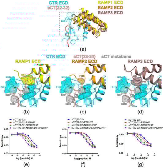 Hypothetical structures of AMY receptor ECDs and the peptide binding assay with sCT(22–32) N26D/S29P/P32HYP mutations. (a) Overview of the hypothetical structures of AMY receptor 1/2/3 ECDs. The crystal structure of CTR ECD (PDB 6PFO, Mol A) with sCT(22–32) and RAMP 1/2/3 ECDs structures from the CGRP (PDB 6E3Y) and AM1/2 receptors (PDB 6UUN and 6UVA) were used to build hypothetical AMY receptor 1/2/3 ECDs. The peptide binding pocket and proximal RAMP ECD residues were boxed with a gray dotted line. (b–d) Hypothetical structures of AMY receptor 1/2/3 ECDs with sCT(22–32) N26D/S29P/P32HYP mutations. CTR ECD D77, W79, H121, E123, and N124, sCT N26D, S29P, and P32HYP mutated residues, and RAMP ECD residues (W84 and P85 in RAMP1/3 ECD and F111 in RAMP2 ECD) were shown both with stick and surface representations. The distances between sCT HYP32 and the proximal RAMP ECD residue and between sCT HYP32 and the CTR ECD D77 main chain were shown as a dotted red line. For (c), the side chain of F111 of RAMP2 ECD was unavailable in the original cryo-EM structure (PDB 6UUN) and only the first carbon of the side chain was shown as stick and surface representations. (e–g) FP competition peptide binding assay with sCT(22–32) N26D/S29P/P32HYP mutations. FITC-AC413(6–25) with Y25 mutation was used as a peptide probe. Representative peptide-binding curves were shown from three independent experiments.