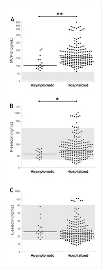 Serum MCP-2 (A), P-selectin (B), and E-selectin (C) in asymptomatic (n = 16) and hospitalized (n = 188) COVID-19 patients. The grey area indicates the reference intervals in healthy subjects [29,30]. * p < 0.01; ** p < 0.001.