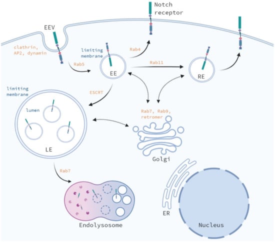 The majority of internalized Notch receptors are directly transported back to the plasma membrane mediated by Rab4 (Figure 2). The cargo is sorted by the retromer complex, composed of a cargo-sorting sub complex (Vps35/Vps26/Vps29) and a sorting nexin sub complex []. A fraction of the internalized Notch receptors in early endosomal vesicles fuse with early endosomes via Rab5 or are indirectly transported back to the plasma membrane via Rab11-positive recycling endosomes. The receptor-mediated protein 8 (Rme-8), or DNAJC13 (human ortholog), regulates intracellular trafficking by cargo sorting, transport from the endosomes towards the Golgi network, and receptor recycling in both Drosophila and mammals [,,]. In Drosophila, depletion of Rme-8 leads to an accumulation of both full length and S3-cleaved Notch receptors in enlarged Rab4+ endosomes. This disturbance in Notch receptor trafficking results in a decreased number of Notch receptors at the plasma membrane and reduced Notch activity []. The effect on Notch receptor trafficking upon loss of DNAJC13 in mammalian cells remains unstudied.