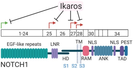 In mammals, ligand-independent Notch1 signaling has been reported during T-cell development in mice []. This ligand-independent Notch1 signaling is the result of an alternative use of the Notch1 promoter leading to the expression of alternative transcripts downstream of the canonical promoter (Figure 3). These transcripts encode a truncated, membrane-tethered Notch1 variant. Ikaros, which is required for proper lymphoid differentiation of early hematopoietic progenitors, directly regulates the epigenetic state of the canonical and alternative promoters of Notch1, where it acts as a negative regulator of Notch1 signaling. Loss of Ikaros during T-cell development leads to aberrant Notch1 activation and rapid development of T-ALL. Together these data prove that ligand-independent Notch signaling does not only drive carcinogenesis, but can also occur during physiological signaling in mammals. Whether ligand-independent Notch signaling is used during additional steps of mammalian development or homeostasis during adult life remains elusive.