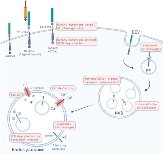 Besides mutations in the Notch receptor that induce the spontaneous unfolding of the ECD of Notch, alternative shedding mechanisms have been proposed. Upon endosomal trafficking the Notch receptor can be transported towards the lysosomes for degradation. Therefore, another possible mechanism of ECD shedding could be the degradation of the ECD by hydrolases, to which also Adam metalloproteases belong, and subsequent γ-secretase cleavage, which are both present in lysosomes, resulting in the active form of Nicd, which may be released and translocated towards the nucleus []. Notably, during the incorporation of the Notch receptor into endosomes, the Notch receptor is located to the limiting membrane on the late endosome, resulting in the intracellular domain of Notch protruding into the cytosol [,,]. During this intracellular trafficking, γ-secretase may cleave the receptor at the free S3-site, releasing the active Nicd into the cytosol, which can subsequently travel towards the nucleus and activate its downstream targets. However, excessive shortening of the extracellular domain of Notch may be still required for γ-secretase cleavage, since γ-secretase cleavage increases upon a shorter Notch receptor substrate [].